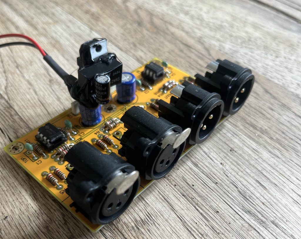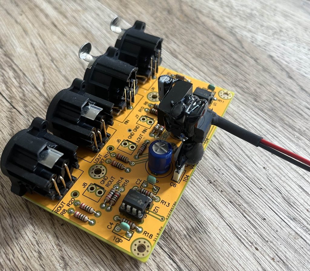 Die Ein- und Ausgangsbuchsen für die symmetrischen Signale sind bequemer Weise schon auf der Platine montiert.