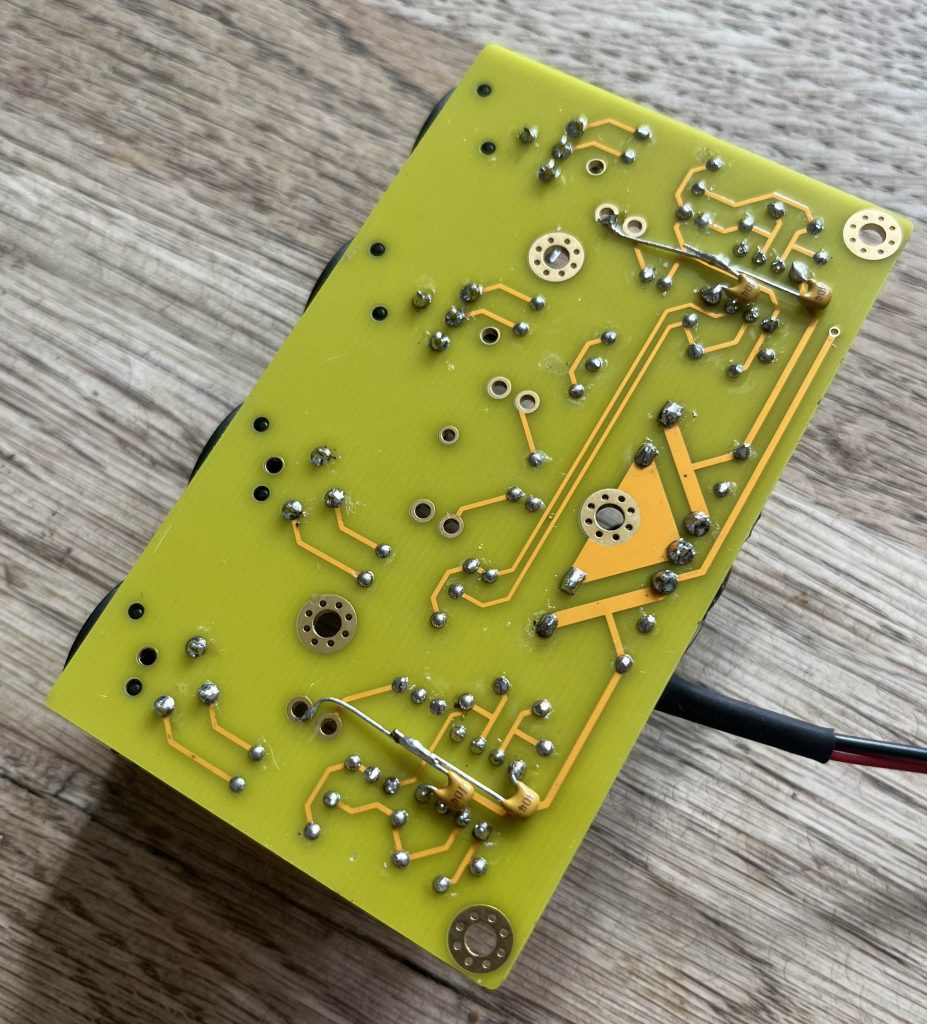 Um auch die letzten Reste von Störungen auf der Spannungsversorgung zu filtern, werden 4x 100nF Abblockkondesatoren auf der Platinenunterseite direkt an die Spannungs Pins der Operatinsverstärker gelötet. Die Gegenseite wird an den nächsten Massekontakt geführt.